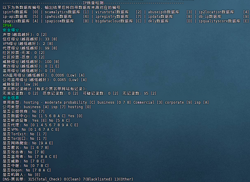 IP质量检测是评估服务器能否稳定用于业务的关键。本次测试综合查询了15个全球权威的IP信誉数据库: