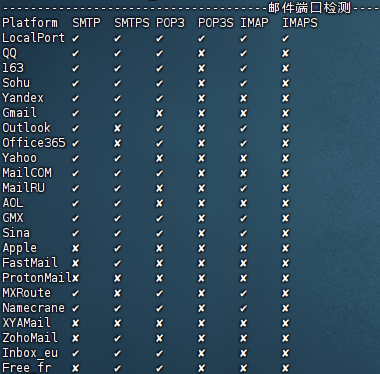 测试模拟了本地端口以及对全球25家常见邮件服务商(如Gmail, Outlook, QQ邮箱等)的SMTP、SMTPS、POP3等端口的连接情况。